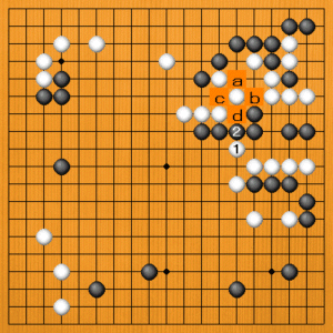 (1図) 手順図の白6で、白1とノゾくのが普通のようですが、黒2とツギます。後に黒aとアテられるのが嫌な形です。白b、黒c、白dと先手で一目を抜くことができますから、白はこれを嫌いました。 |