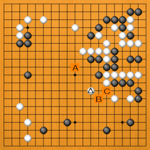 白△とケイマしたところです。この局面で、候補手A・B・Cのどの手を選びますか? |