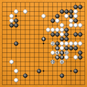 (5図) 黒1、白2に黒3と押すのも、白4から6とマゲられます。黒7のノビは省けませんが、ここで白8のカケツギが好手です。黒は9と右辺をワタるよりなく、白10のゲタで取られてしまいます。 |