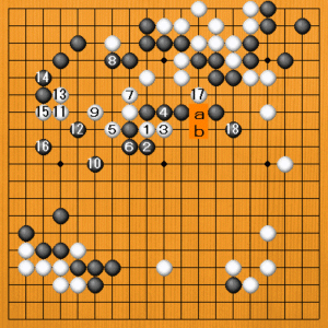 (2図) 続いて黒12と切らせてから白13と切ってコウを仕掛けます。黒14の取りに白15のコウ立てがあり、黒16に白17と取り返せば黒にはコウダテがありません。続いて黒aには白bで大丈夫ですから、1図の黒2の切りは心配ありません。 |