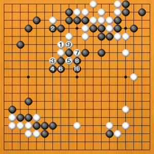 (手順図) 私の実戦です。白は右辺から右下にかけて大きな地を持っているので、左上をうまくサバくことができれば成功です。白1に黒2とハネてきたところがテーマ図です。 |