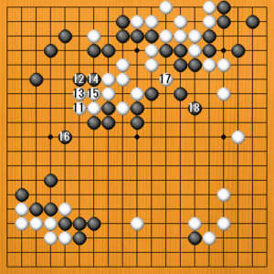 (6図) 続いて白11のノビには黒12の急所から黒14、16と攻められて、ちょっと白は危険です。白17とノゾいても黒18でかわされてしまいます。5図白1の引きは白が重くなるので、黒の攻めが厳しくなります。 |