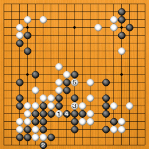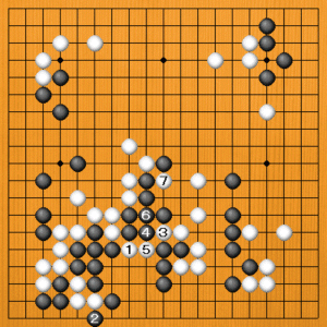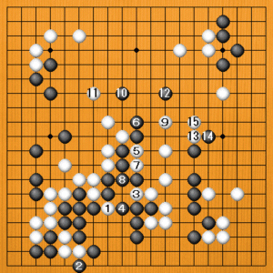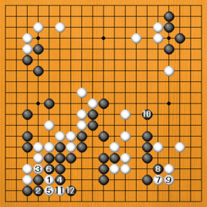 (手順図) 私の白番です。白1のハサミツケが狙いの一手。、黒2には白3、5と踏み込みます。黒6の切りで取られてしまうのですが、白11、黒12となった後で、白から鋭い狙いがあります。 |