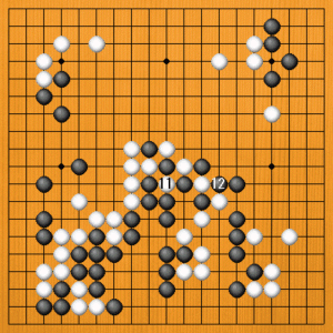 (8図) 白11と取るよりありませんが、黒12と取られて下辺の白が取られてしまいます。ちょっとした手順前後で、大変な結果の違いになりました。 |