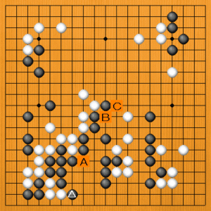 黒△とオサえてきたところです。この局面でA・B・Cのどの手を選びますか? |