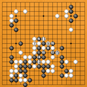 (6図) 白1から5のとき、黒は6とノビてきました。そこで白7とアテれば黒を先手で分断することができます。続いて白11から15までとなれば黒は弱い石を二つシノがなければならず、これは白の成功です。 |