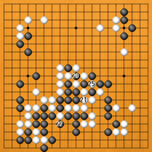 (4図) 黒20に白21とアテれば、黒22と取るしかありません。白23と取り返したときに黒にはコウダテがなく、黒24に白25と二子を取れば成功です。本図は私の読み筋でした。 |