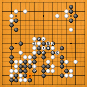 (7図) 白1(B)の切りは不正解です。手筋ではあるのですが、すぐに切るのは少し危険です。黒2から10までと正解図と同じように進行したときに、ここで白11と切っても、黒12とカカえられてしまいます。白は中央で大きな損しているので、白aの切りは話が小さくなっているのです。 |