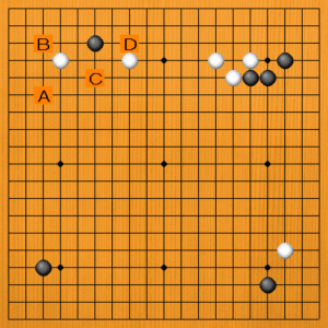上辺は、相手の石が三つ以上多いですから、ここはサバくところです。サバキはツケが効果的です。黒1(D)のツケが正解です。白2のオサエに黒3と切り違えるのが第一歩になります。