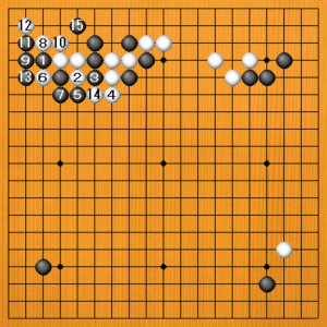 隅の白は動きが不自由で、黒は十分サバいています。白6、8から隅を動いても、14の切りは無理ですから怖くありません。もちろん、黒15とコスんで白が持ちません。