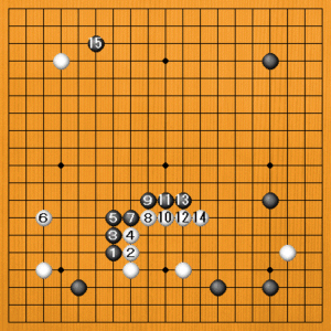 黒1のカケに、白2、4と押してくれば、黒3、5とノビます。白6のヒラキを待って、黒7が“千両マガリ”という絶好点になります。黒9から13の押しまで決めて、15のカカリに回れば、中央の厚みが働いた碁になりました。