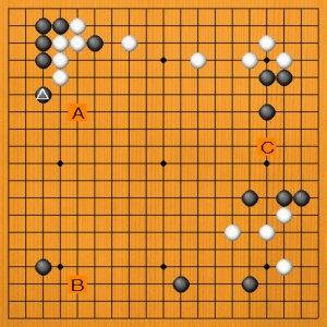 Aのケイマで上辺を広げるか、Bの大場のカカリか、Cの打ち込みか。