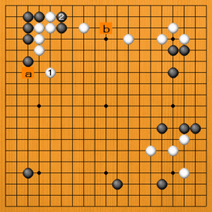 白1(A)のケイマは感じのいい手です。次にaのツケを見ています。ただ、黒2からbの打ち込みの具合で、まだ上辺は地とはいえません。白1はまだ早いでしょう。