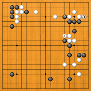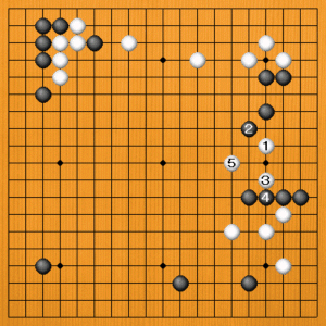 黒1、3の出切りから、黒23となったところです。左辺の白が薄くなっています。