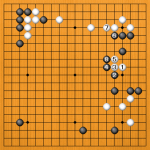 勝負手というのは、反撃が怖い意味があるからです。黒2の肩ツキから4とハネられると、白5とマゲるしかありません。そこで黒6と押してきたときに、本来は白7とノビたいのですが、これは黒8で封鎖されて参ってしまいそうです。
