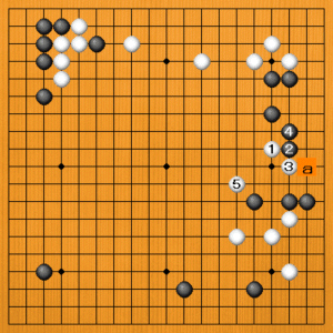 白1の打ち込みに、黒は戦いを避けて、黒2、4とツケ引いたのが実戦です。白5が軽い手でした。次に白aとサガろうとしています。