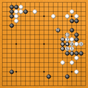 白1のノゾキから3とサガって、強引にワタリを止めにいくのは、黒4のノゾキから12まで封鎖されて、これは白が危ないのです。