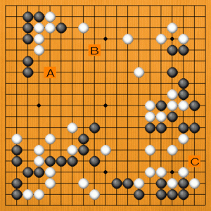 Aは上辺の模様を広げながら左辺の白に援軍を送る手です。Bは上辺をはっきり囲う手です。Cは生きを確実にする手です。