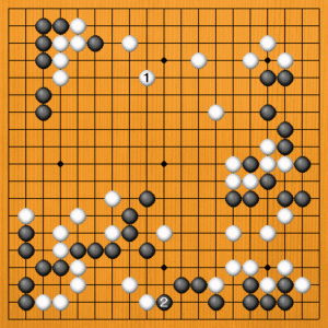 | 碁は中盤の勝負所です。白が中央の六子を捨てて、左辺でうまくサバきました。この後も、難しい戦いが続きます。 |