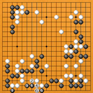 白は1とツイで頑張りました。黒2の出に、白3と外からオサえてかわしたのは仕方ありません。