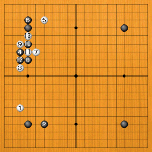 白7のボウシで、黒の出方をうかがいました。井山少年は黒8とハザマを突いて出てきました。白9のツケに対して、黒10のハネ出しから12とツイで、最強に応じています。ここで白13とカカえたところがテーマ図です。