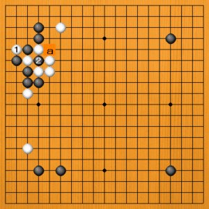 白1と切られても、黒2と抜いて、黒が悪くなることはありません。まだ序盤で白からいいコウ材はありませんから、次にどこを打たれても、黒aと打ち抜いてしまえばいいのです。
