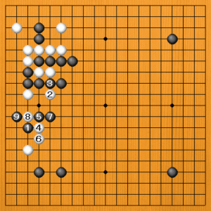 隅は損しましたが、黒1と打ち込んで、どんどん戦いを仕掛けてきました。白4、6のツケ引きにも黒7とノビて元気いっぱいです。白8と切られても、黒9と下から打って全部取るつもりです。