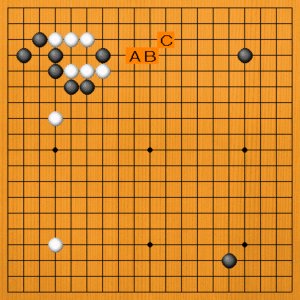 左上の定石が一段落しようとしています。白から上辺にヒラキたいのですが、A~Cのどれが正しいでしょうか。