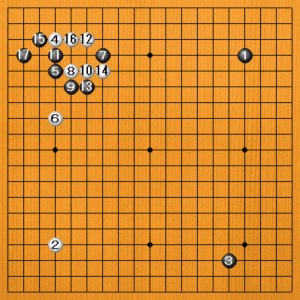 テーマ図までの手順です。左上の定石は、現在とは若干違います。ここで白が上辺にヒラいて一段落になります。
