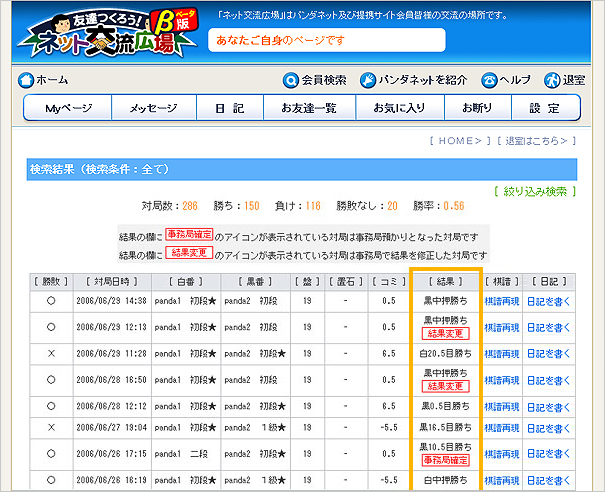 (ネット交流広場「対局結果、棋譜検索」「結果」のマーク入りサンプル図)
