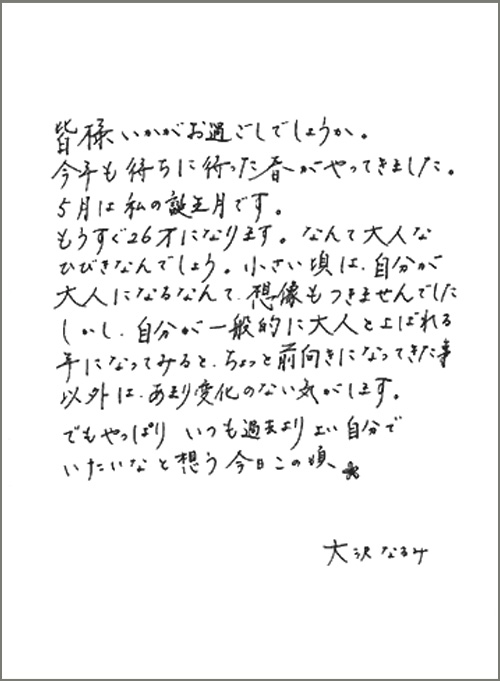 もうすぐ26歳になるという大澤奈留美二段の近況写真や直筆お手紙をご覧いただけます。