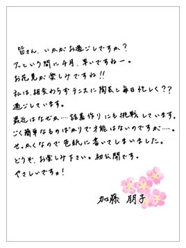 詰碁作りに挑戦されているという加藤朋子五段の近況写真や直筆お手紙をご覧いただけます。