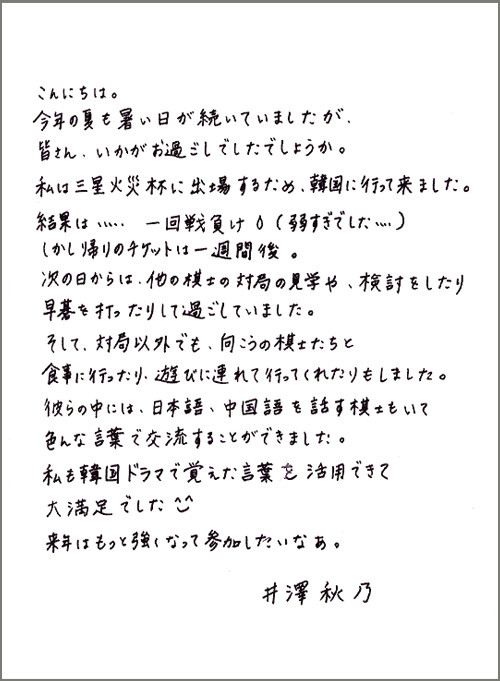三星火災杯に出場するため韓国に行かれていた井澤秋乃三段の近況写真と直筆のお手紙をご覧になれます。