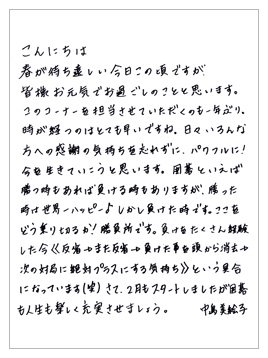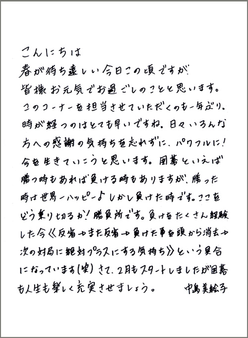 日々感謝の気持ちを大切にしていらっしゃる中島美絵子初段の近況写真と直筆のお手紙をご覧になれます。