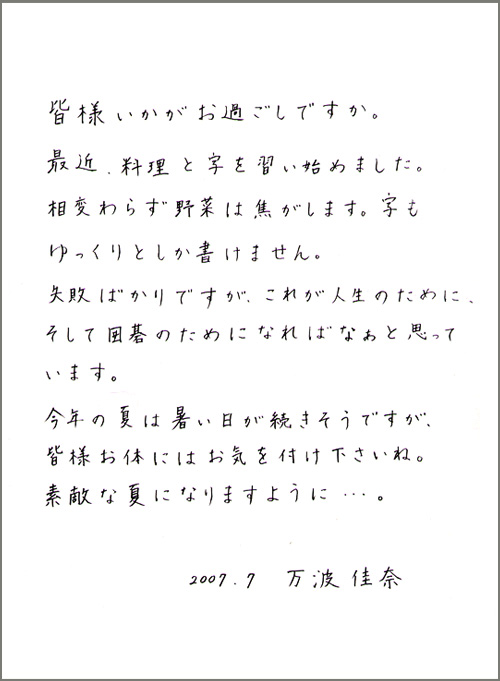 料理と字を習い始めたという万波佳奈四段の近況写真と直筆のお手紙をご覧になれます。