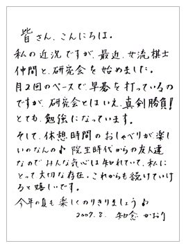 女流棋士の皆さんと研究会を始めたという知念かおり四段の近況写真と直筆のお手紙をご覧になれます。