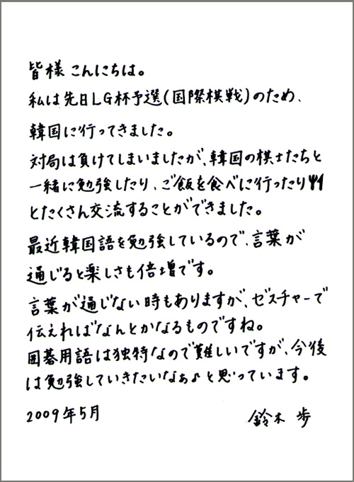 国際棋戦の予選で韓国に行っておられた鈴木歩四段の近況写真と直筆のお手紙をご覧になれます。