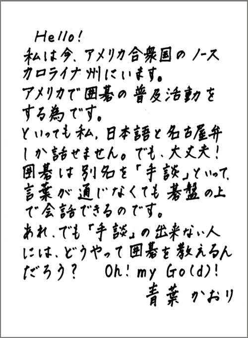 アメリカで囲碁の普及活動をされている青葉かおり四段の近況写真と直筆のお手紙をご覧になれます。