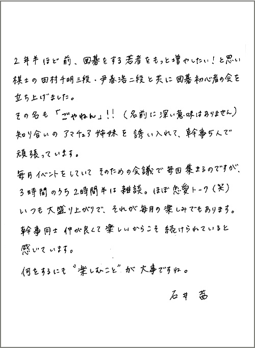 囲碁初心者の会「ごやねん」に力を入れている石井茜二段の近況写真や直筆お手紙をご覧いただけます。