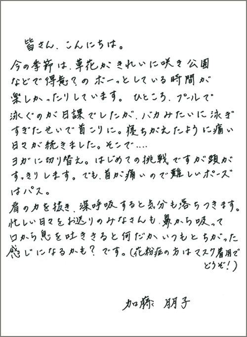 近頃ヨガを始められたという加藤朋子六段の近況写真や直筆お手紙をご覧いただけます。