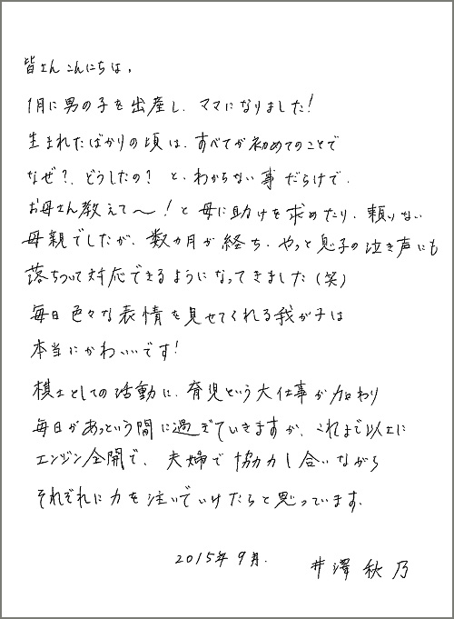 1月に男の子をご出産されたという井澤秋乃四段の近況写真や直筆お手紙をご覧いただけます。