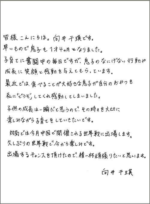 1歳4ヶ月になられた息子さんとのお写真や向井千瑛五段の直筆お手紙をご覧になれます。