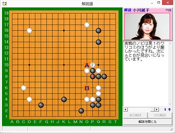 実戦のノビは黒1のワリコミの方がより厳しかったですね。次にAとBが見合いになっています。 実戦のノビは黒1のワリコミの方がより厳しかったですね。次にAとBが見合いになっています。