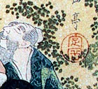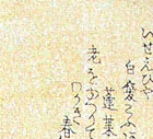 seal Sadaoka). The first poem in the upper right by, Shofuken Shirabe reads: shiraga kobu aru horai ni oi o yuzurite wakaki haru kana The crayfish and the 'white haired' kelp (kobu) turn the Island of Horai over to the elderly this still young spring. The 'Ise ebi' is a crayfish native to Japan and 'kobu' is a type of kelp. The poet calls it 'white haired', meaning it is covered with salt, but it also refers to the white hair of the elders, the inhabitants of the mountainous isles of Horai (Penglai in Chinese), the fabled home of the immortals. The second poem in the upper left, by Shoso Chieda reads: tsukete wakayagu haru no hi ni oi ga kashira no yuki mo kiekeri Because of black hair oil used to make them look younger, in the spring sun the snow on the heads of the old men has disappeared. | ||