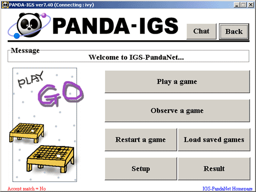 The Telnet window has four options on the tool bar, Clear the window, Accept match, AYT, and Check network speed. Clear the window does just that, removes all text from the Terminal window. Note that the Terminal window has a very small history buffer, and will clear itself when the buffer is full. Accept match is a toggle for being open for playing, your status is indicated on the drop-down menu, and in the bottom left corner of the Main window. AYT means "are you there", and is for checking on the status of your connection, and Check network speed measures the time it takes for packets to traverse the Internet from your computer to the IGS-Pandanet server.