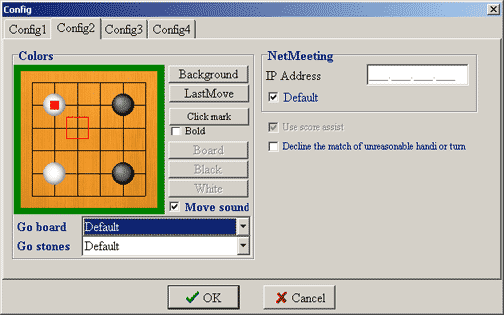 To set, cancel, or change your Match Conditions, click the Change button under the Config 1 tab, this brings up the Match Conditions window. This window has two tabs, one for PandaNet style and one for Byoyomi style conditions. Under either tab you have options for choosing color, setting handicap, selecting board size, setting the initial and byoyomi times, and the number of stones to be played in byoyomi. By clicking on range edit, you may specify a range for Initial time, perhaps 1 to 10 minutes, the Byoyomi time, perhaps from 5 to 30 minutes, and the number of Byoyomi stones, perhaps 10 to 25 stones. If you decide you do not want a range for any option, simply click no range for system default. PANDANET Style