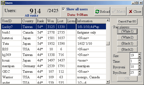 On the right side of the window above, there are three buttons, Match cond., Config, and Pair. Match Cond. and Config are part of the Setup, but they are placed here for convenience in case you wish to change your match preferences. The Pair button is for playing Pair Go (also known as team go). Pair Go involves four players.