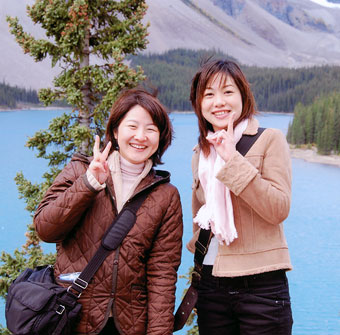 "With Kuwahara san at Moraine Lake of the Rockies."
