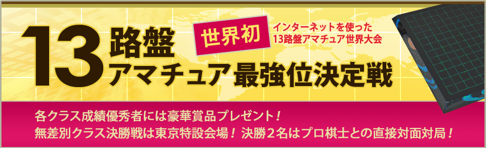 パンダネットでは世界初のインターネットを使った13路盤アマチュア世界大会を開催いたします。優勝者には豪華賞品が贈られます。