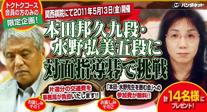 いまや恒例の大人気指導碁企画を今回は関西棋院にて開催! 本田邦久九段と水野弘美五段がパンダネット会員およびパンダネット提携サイト会員のあなたと実際に碁盤で、対面指導碁をしていただけます! このビッグチャンスをどーんと抽選で14名様にプレゼント! 皆さま奮ってご応募ください。なお、この企画はトクトク[対局&学習]コースの会員様のみの限定企画となっております。